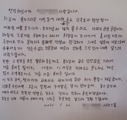 이후 해당 전복집의 리뷰에 악플이 달리고 항의가 거세지자 해당 가게 사장님은 가게 블로그에 친필로 쓴 사과문을 올렸습니다.